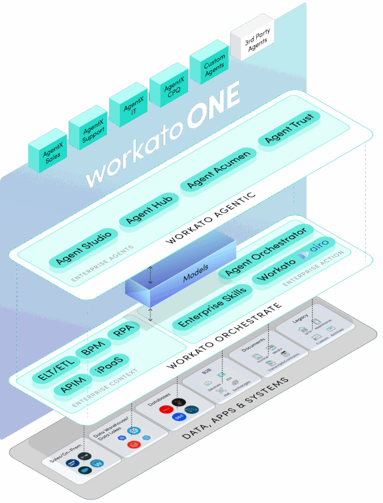 Workato One is an agentic stack designed to be the foundation of your agentic enterprise. We believe that, to unlock the synergy between automation and integration, your company needs robust architecture that reimagines the tech stack without the traditional silos. Workato One brings your AI, data, apps, and systems together, bundling the 4 things we see as a key capabilities into a single platform: