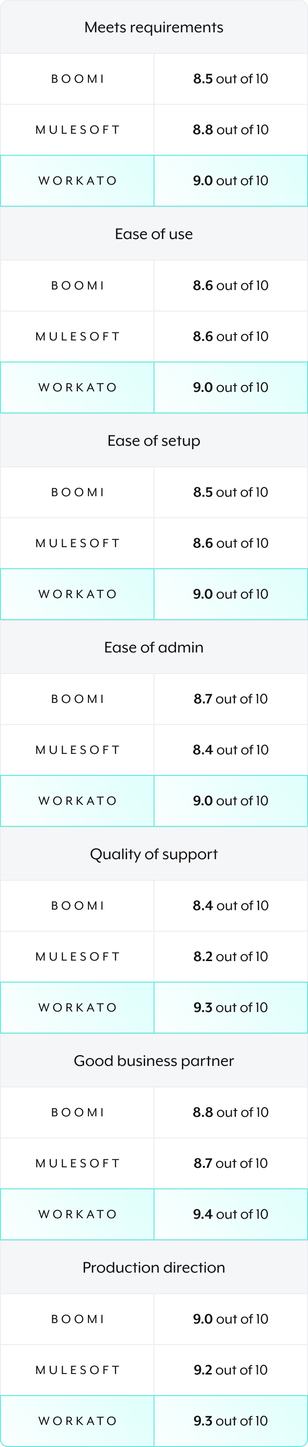 Workato is the only iPaaS vendor named a Gartner Peer Insights Customers' Choice in 2025, outranking the competition in every category. Our fair pricing, enterprise-grade governance, and hands-on support make Workato the trusted choice—whether you're integrating systems today or deploying AI agents tomorrow.