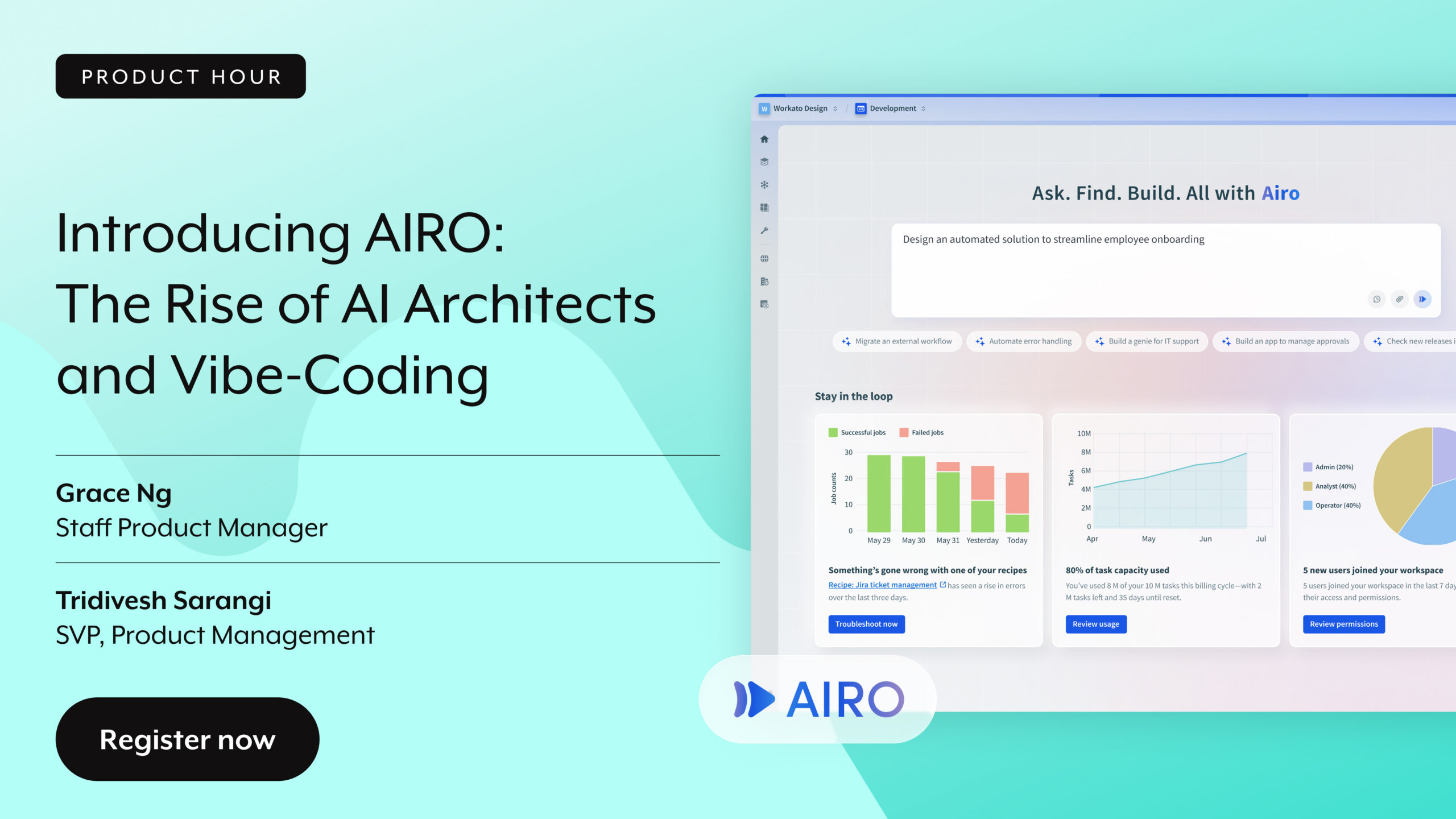 The rise of “vibe coding” and AI-assisted development has fundamentally changed how teams build software — and raised the bar for integration platforms. You’ll see how AIRO moves beyond task-based copilots to act as a solution architect agent, helping teams go from fuzzy problem statements or PRDs all the way to production-ready Workato assets. AIRO analyzes requirements, identifies gaps, maps business processes, and generates a complete asset plan spanning recipes,…