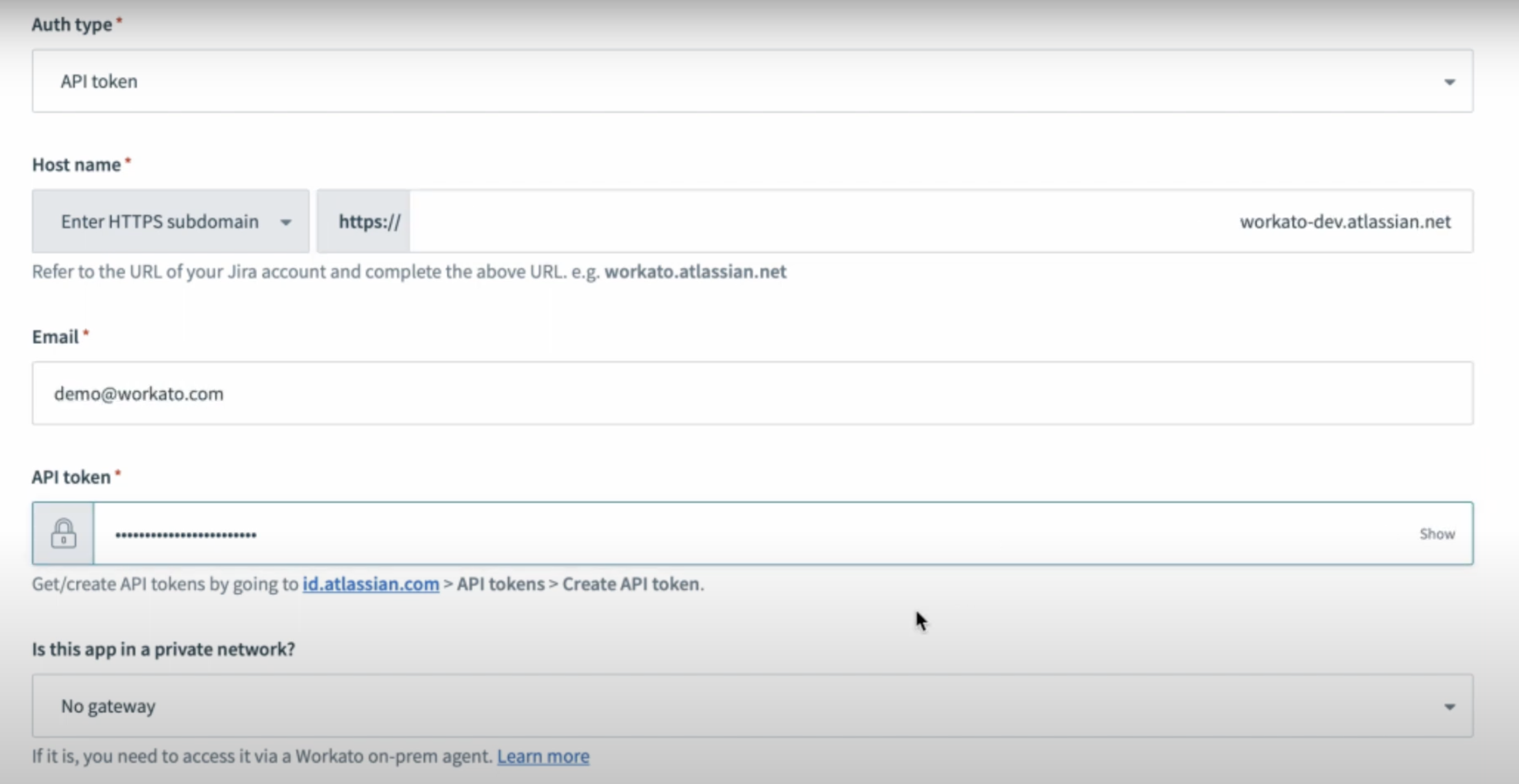Host name: Complete Jira instance URL used to login to Jira.Email: Email of Jira account to link to WorkatoAPI token: To obtain your API token from your Atlassian account, navigate t0 https://id.atlassian.com/manage-profile/security/api-tokens(opens new window)