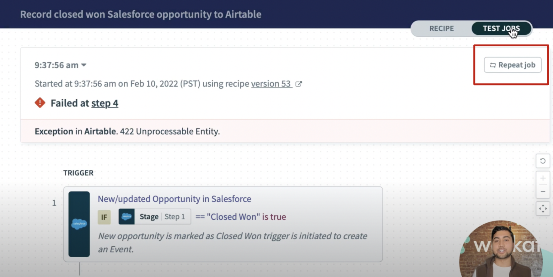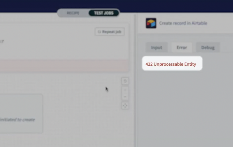 After setting up your recipe, run a test job to identify any potential errors. In this case, the job report from the test job shows that the recipe failed at step 4 and it returns a 422 error message. At this stage, just the error message alone does not provide us enough information to troubleshoot the problem.
