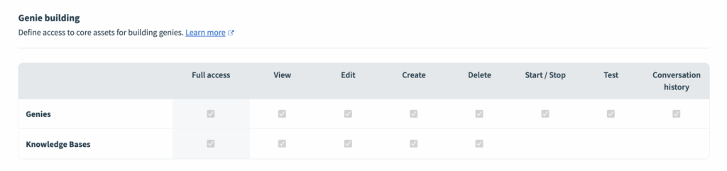 New granular permission settings give administrators precise control over Conversation History and Test Mode data in Agent Studio. Conversation History contains all historical chat records between Genies and users, which may include private information. Test Mode allows builders to query Genies and retrieve data from connected Knowledge Bases.