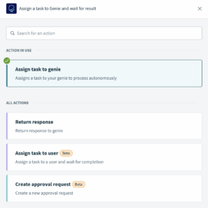 Assign tasks to Genies directly within recipes, skills, or MCP/API endpoints so they can operate autonomously and drive complex, AI-powered workflows. Use the “Assign task to Genie” action to define the goal, pass input data or files, and maintain context with a conversation ID. The Genie executes the task, retrieving, analyzing, or collaborating with other Genies, and returns either free-form results or structured data pills for seamless downstream automation.