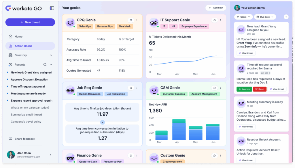 Why this matters: As organizations scale Genies across their business, performance and ROI signals often become scattered across reports and tools. Action Board brings this visibility together inside Workato GO, giving leaders a clear view of value, managers the KPIs they need to guide their teams, and employees the real-time insights and tasks that help them stay on top of their work.