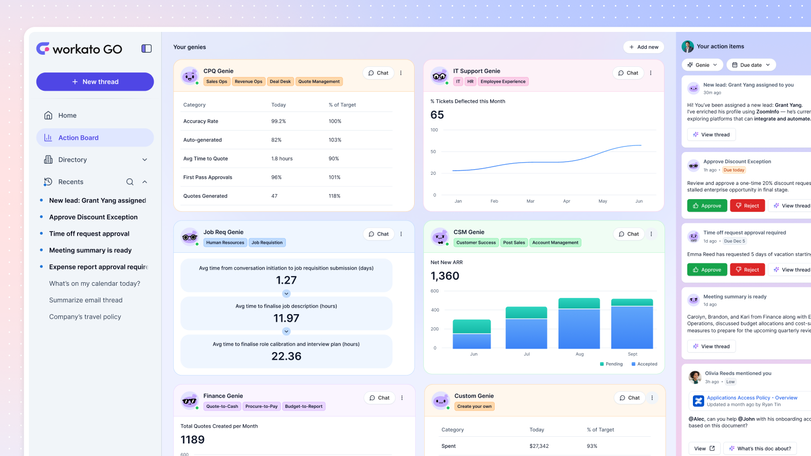 Why this matters: As organizations scale Genies across their business, performance and ROI signals often become scattered across reports and tools. Action Board brings this visibility together inside Workato GO, giving leaders a clear view of value, managers the KPIs they need to guide their teams, and employees the real-time insights and tasks that help them stay on top of their work.