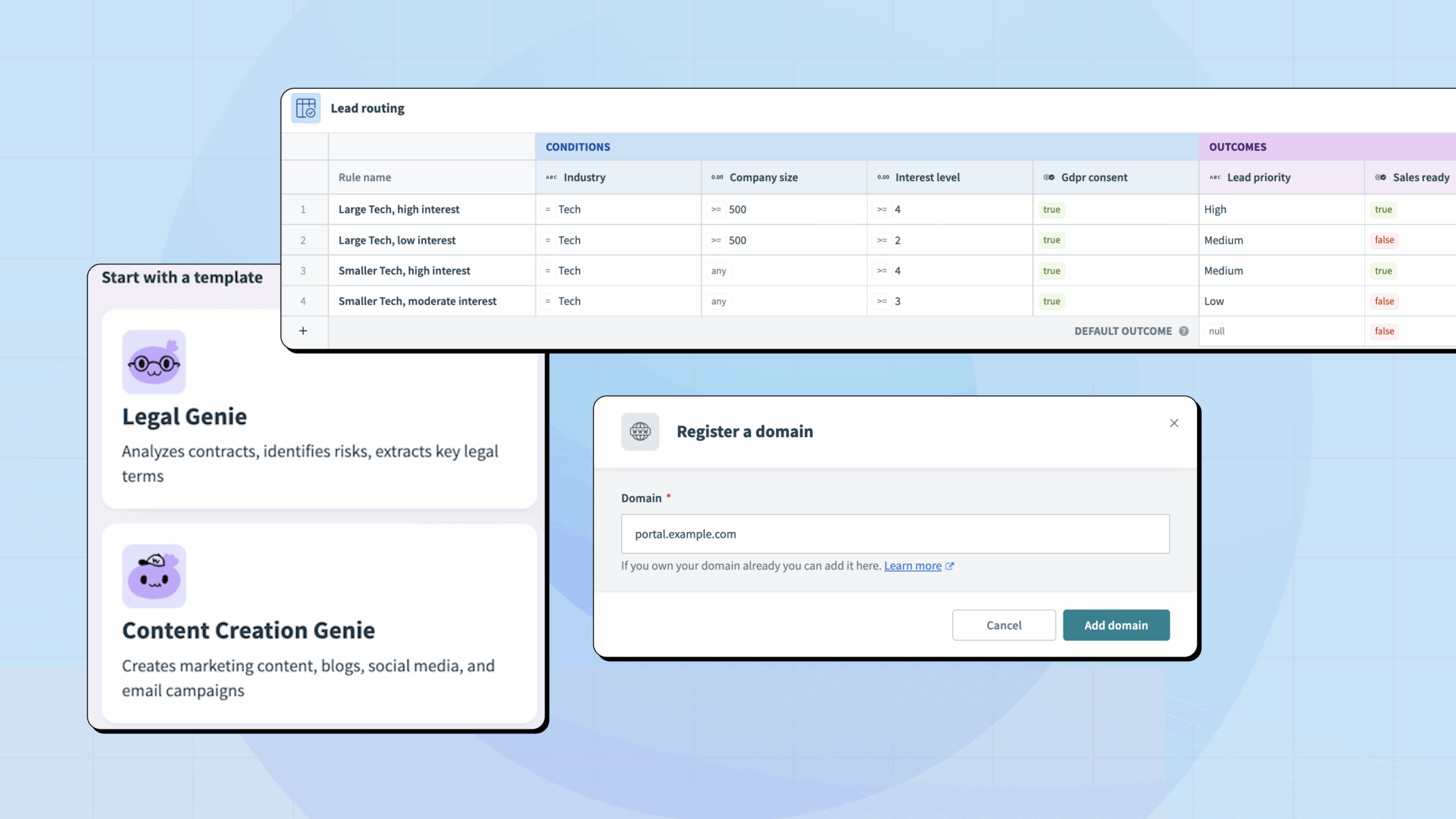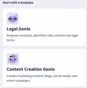 - Templates: Jumpstart Genie builds with pre-defined templates tailored to specific use cases, each with a job description and set of skills.
