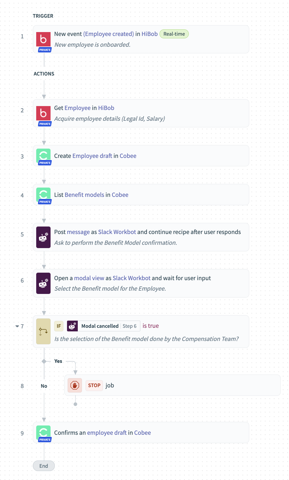 Automation here refers to the seamless orchestration of employee onboarding and benefits confirmation. When a new hire joins your organization through Hibob, this recipe instantly creates an employee draft in Cobee, capturing all the essential employee details. It then initiates a smooth process of benefit model confirmation via Slack, involving the Compensation team. This efficient automation ensures a hassle-free and informed onboarding experience.
