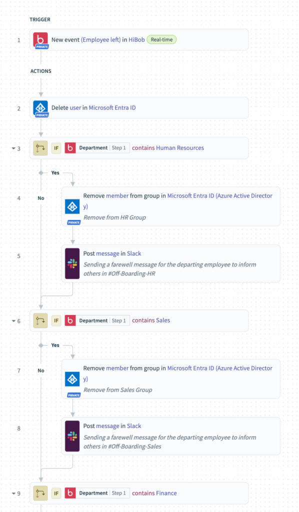 - If department = Finance: The employee is removed from the Finance group, ensuring they no longer have access to financial documents or systems.