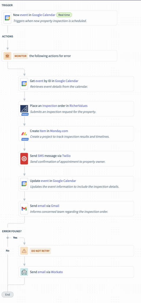 When a new property inspection event is created in Google Calendar, the recipe retrieves the complete event details including property address and inspection requirements. It then places an inspection order in RicherValues with the scheduling information and creates a tracking record in Monday.com to monitor the inspection request. The automation sends an SMS confirmation to the property owner via Twilio, updates the original calendar event with the RicherValues order reference details, and sends an email notification to the concerned team via Gmail informing them that the inspection has been scheduled and ordered.
