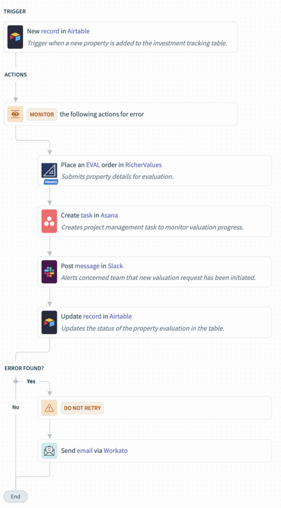 When a new property record is added to the Airtable investment tracking table, the recipe immediately places an EVAL order in RicherValues with the property details for comprehensive evaluation. It then creates a project management task in Asana to track the valuation request and posts a message in Slack to alert the concerned team that a new valuation order has been submitted. Finally, the automation updates the original Airtable record with the RicherValues order ID and status information, creating a complete audit trail of the valuation request process.