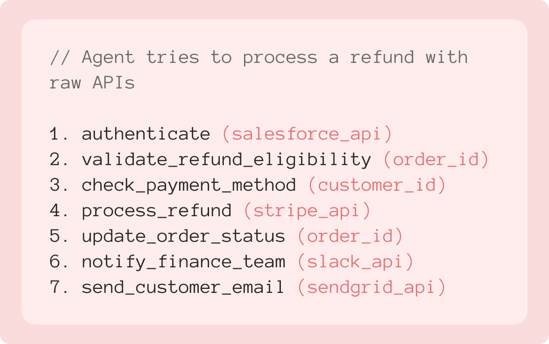 Without an orchestration layer, MCP leaves agents guessing their way through multi-step business processes like refunds, onboarding, or approvals. Each process requires logic, state management, retries, and compliance. all of which MCP alone cannot provide.