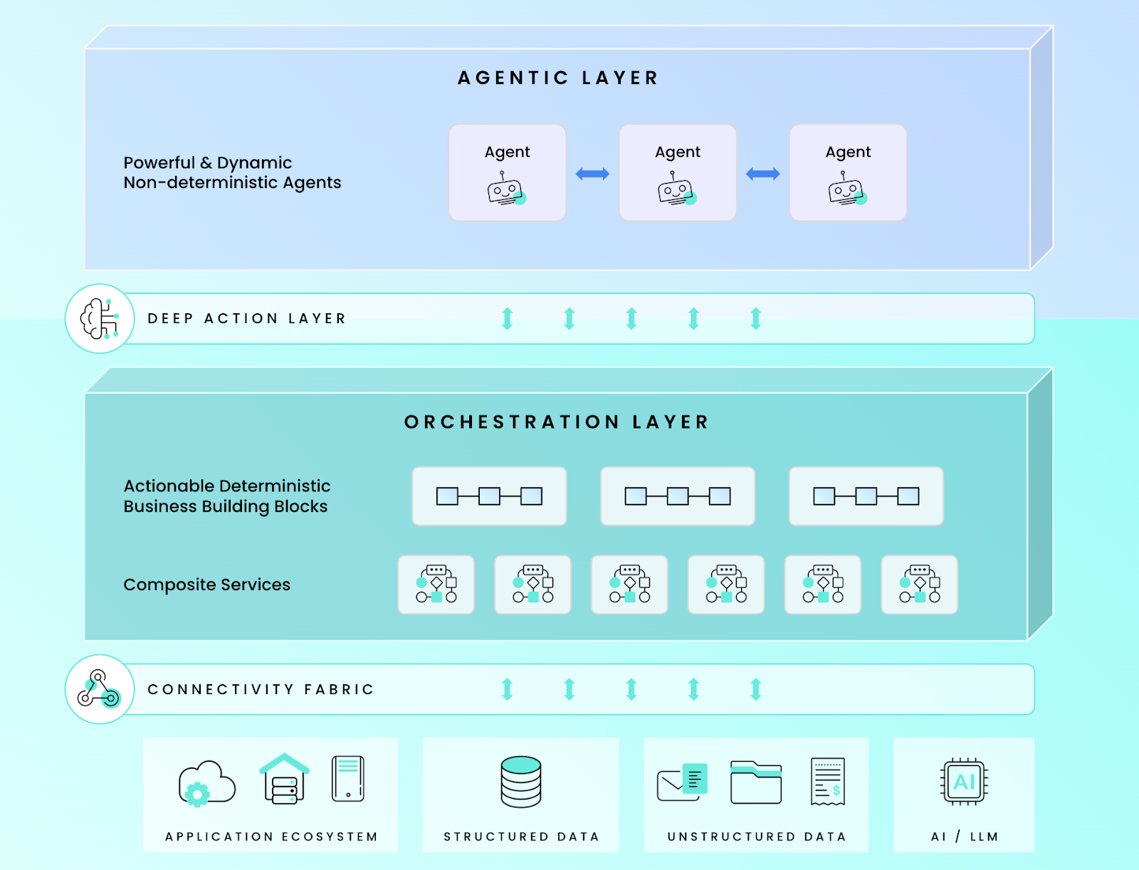 An Agentic Strategy can only reach its full potential with a strong foundation in Enterprise Orchestration, where deterministic business building blocks (e.g., APIs, pre-defined workflows, business rules, data models) can power up the full dynamic (non-deterministic) nature of AI in a governed and secure way (e.g., access control, auditing, human-in-the-loop validation). Orchestration is the connective tissue that binds your technology ecosystem together, integrating applications, structured and unstructured data, and AI models into a seamless fabric.