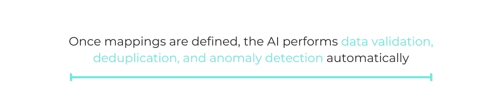 Once mappings are defined, the AI performs data validation, deduplication, and anomaly detection automatically. Over time, it learns to correct common issues and maintain consistency across all integrated data.