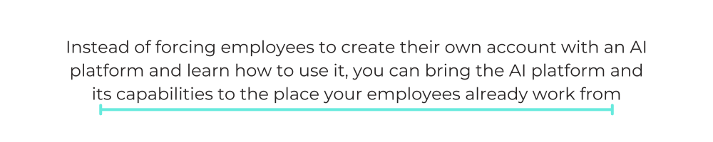 Instead of forcing employees to create their own account with an AI platform and learn how to use it (which also introduces security risks for your business), you can bring the AI platform and its capabilities to the place your employees already work from—your business communications platform.