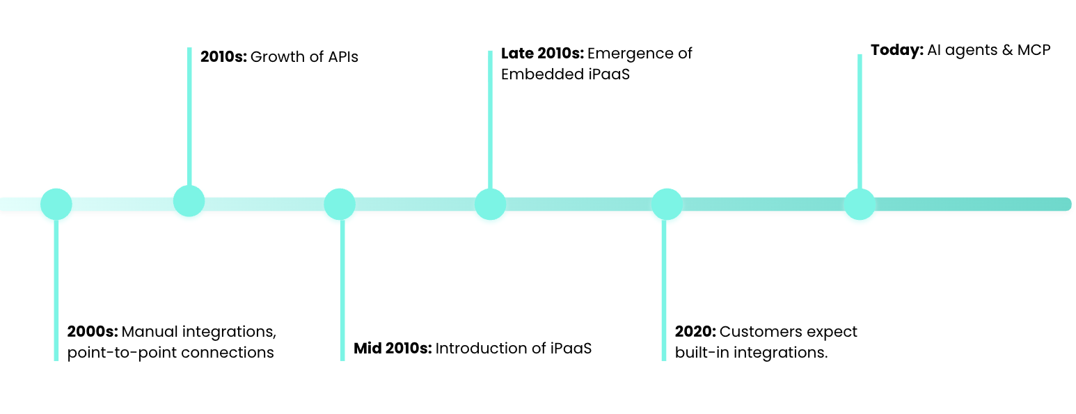 In the early days, that burden fell to the end user – custom code, in-house builds, point-to-point connections. Then came APIs and iPaaS solutions, making building and managing integrations faster and more accessible – until end users didn’t want to manage those integrations at all. They expected the products they bought to handle it. And by the late 2010s, embedded integration was a core product requirement.