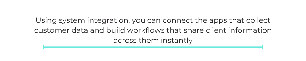 Using system integration, you can connect the apps that collect customer data and build workflows that share client information across them instantly—thereby preventing your team from having to edit any bit of information themselves.