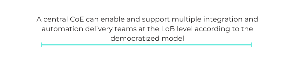 The organizational model could be more sophisticated than this. For example, a central CoE can enable and support multiple integration and automation delivery teams at the LoB level according to the democratized model.