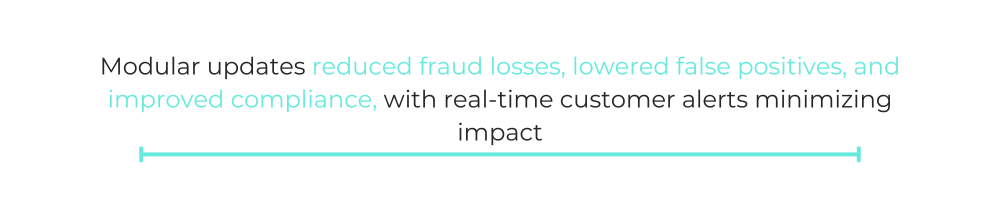 A bank layered real-time transaction scoring, anomaly detection, and identity verification, all orchestrated by an AI agent. Modular updates reduced fraud losses, lowered false positives, and improved compliance, with real-time customer alerts minimizing impact.