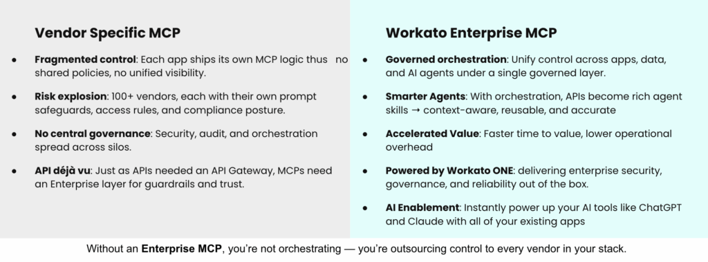 Unlike vendor-specific MCPs, which result in fragmented control, siloed security, and inconsistent governance across hundreds of apps, the Workato Enterprise MCP provides a unified, governed orchestration layer that centralizes control across all apps, data, and AI agents.