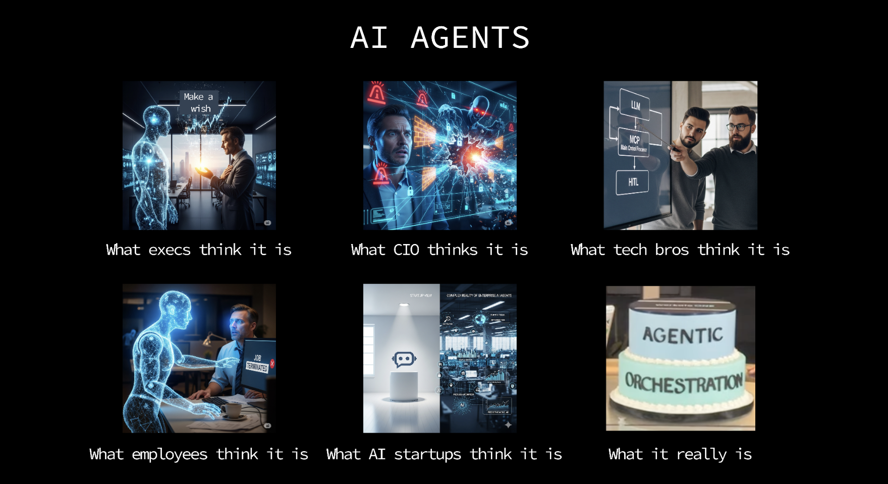 Everyone’s got a take on AI agents. Execs think they’re digital genies where you make a wish and it shall be automated. CIOs think they’re a ticking compliance time bomb. Tech bros are busy diagramming 17 layers of “autonomous intelligence” on a whiteboard. Employees think they’re about to be replaced by a glowing hologram named ChadGPT. And AI startups? They’re rebranding last month’s chatbot with the word “agentic.”