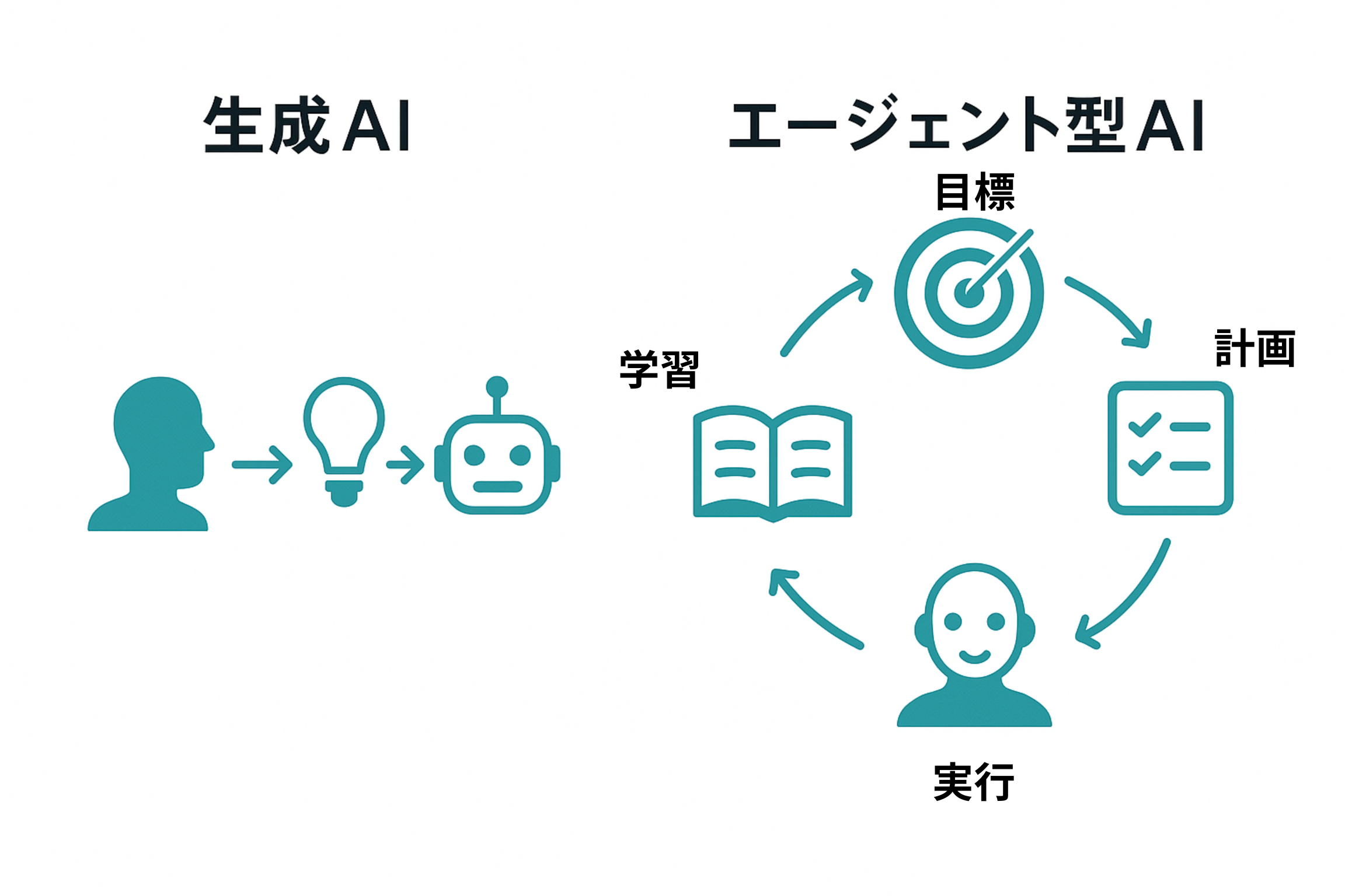 生成AIが「知識を生成する」ものであったのに対し、エージェント型AIは、判断し、行動し、学習し、成果に向けて自律的に動く「実行主体」へと進化しています。
