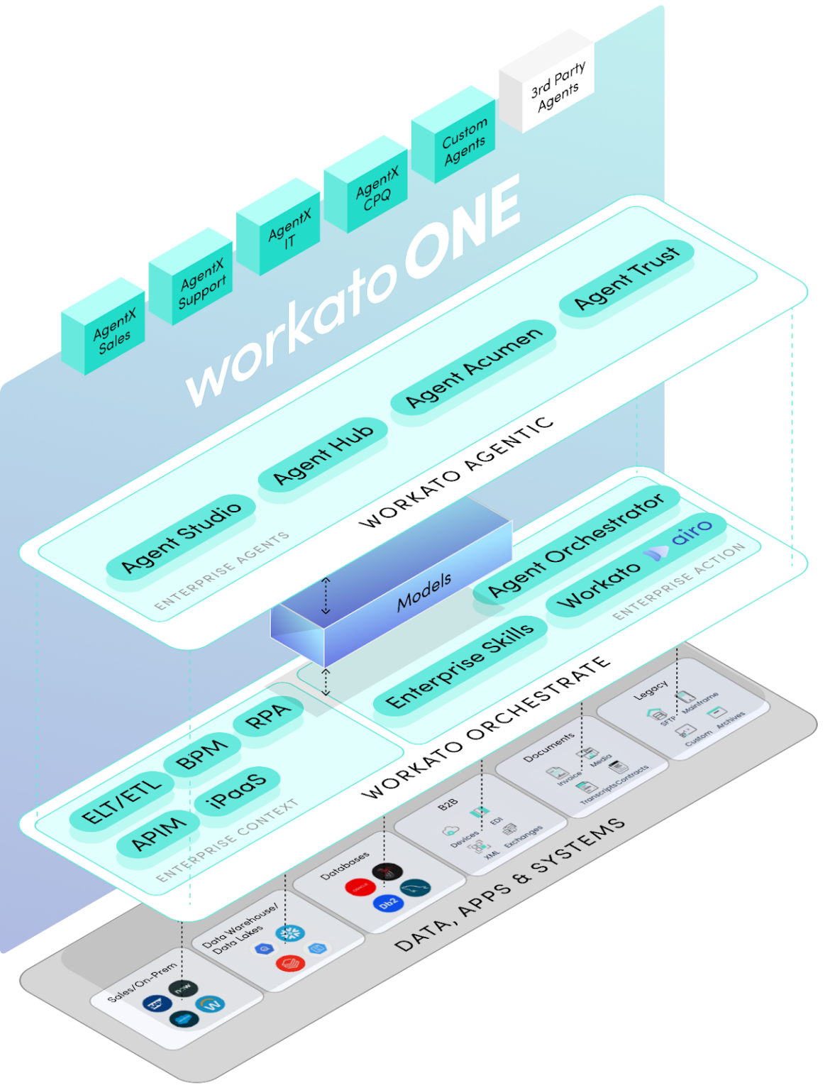 Workato ONEはこのような変化のためにまさに構築されています。エンタープライズアーキテクチャの基盤として機能するように設計されたエージェント型スタックであり、自動化・統合・AIを単一の統合プラットフォームに集約します。