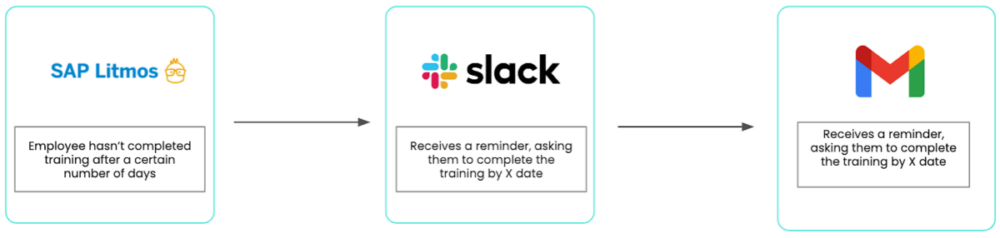 例えば、HRIS(例:Workday)とLMS(例:SAP Litmos)、コミュニケーションツール(例:Slack)を連携すれば、次のようなワークフローを自動化できます。