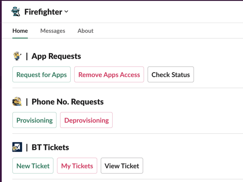 - Slack上でFirefighterを開く:トップ画面で「Request for Apps」を選択。