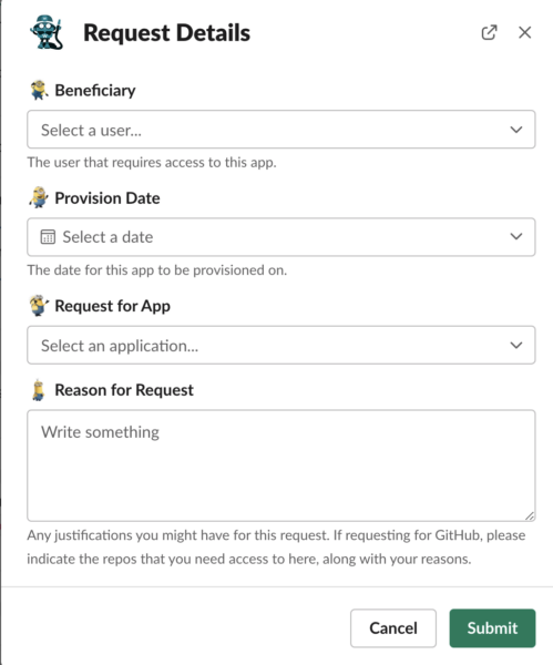 このBotを通じて、社員は現在利用可能なアプリ一覧を確認し、アクセス申請をSlack上で直接行うことができます。