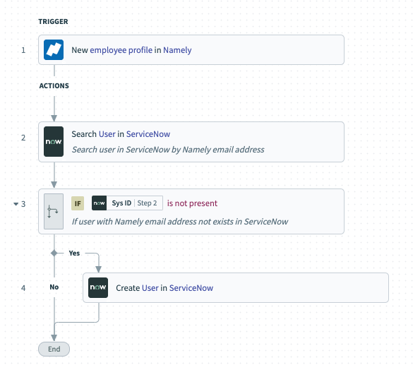 たとえば、NamelyをHRIS、ServiceNowをITSMとして使っている場合は、次のような流れを作れます。