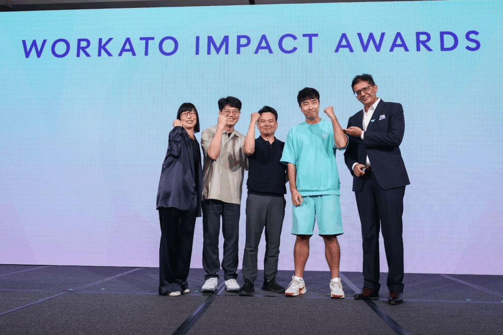 Krafton’s CIO Chris Jang (centre), Infra Platform Team Lead Seongcheol Hong (left) and Infra Team Member Sangmoon Lee (right) take the stage at the World of Workato Singapore 2025 conference to receive the Fastest Time to Value Award, presented by Workato executives, June Lee (far left) and Chandar Pattabhiram (far right)