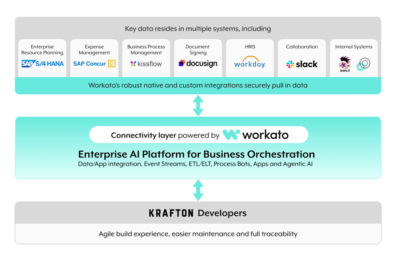 - 12x faster development, 7x faster deployment: “In SAP CI, development normally takes 2-3 days, and deployment to production takes around 1 week, even for simple changes. But using Workato, I was able to develop within 2 hours and go live in one day,” says Sangmoon, from Krafton’s Infra Platform team.