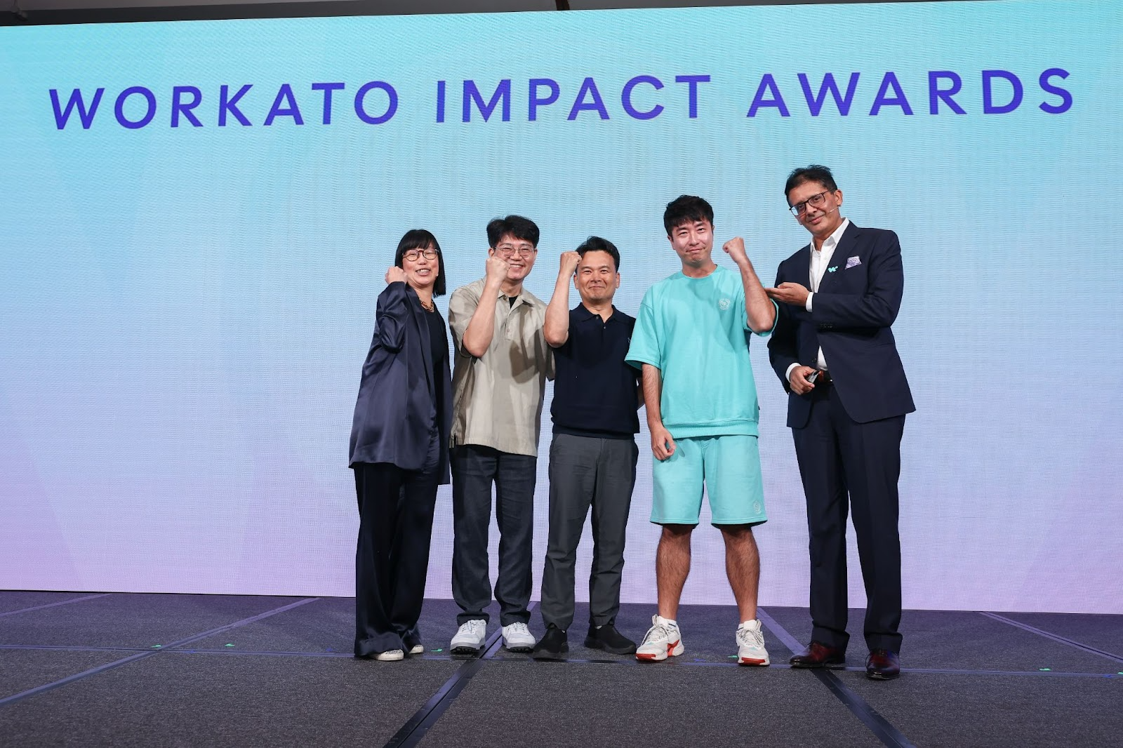 Krafton’s CIO Chris Jang (centre), Infra Platform Team Lead Seongcheol Hong (left) and Infra Team Member Sangmoon Lee (right) take the stage at the World of Workato Singapore 2025 conference to receive the Fastest Time to Value Award, presented by Workato executives, June Lee (far left) and Chandar Pattabhiram (far right)