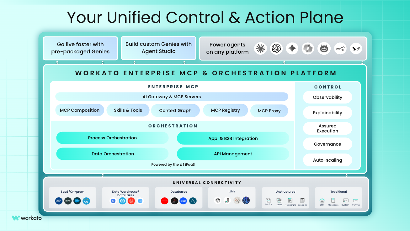 Workato’s Enterprise MCP adds the governed connectivity that makes this practical at scale. Agents operating through the platform inherit the permissions, audit trails, and access controls that enterprise operations require. The decision trace is captured with full context and full governance, which means leadership can trust it as a reliable record of how the business actually operates.