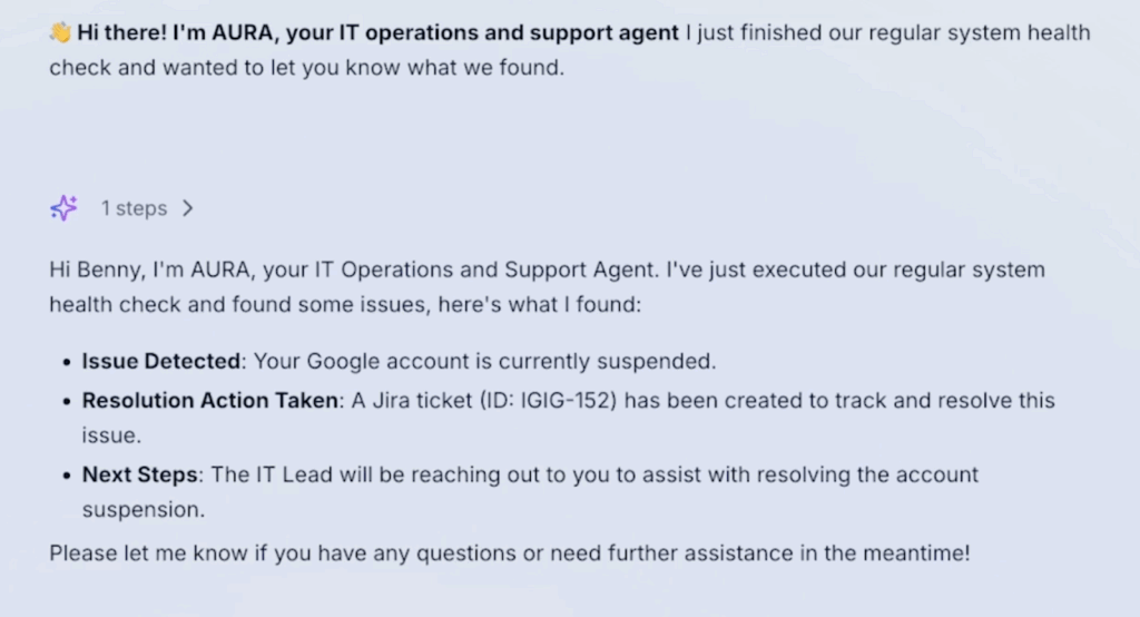 It creates a Jira ticket for the issue, keeping both admins and affected users in the loop. With Aura, password resets, access checks, and all the repetitive work get done without IT getting much involved. This enables teams to focus on more critical tasks that need human attention.