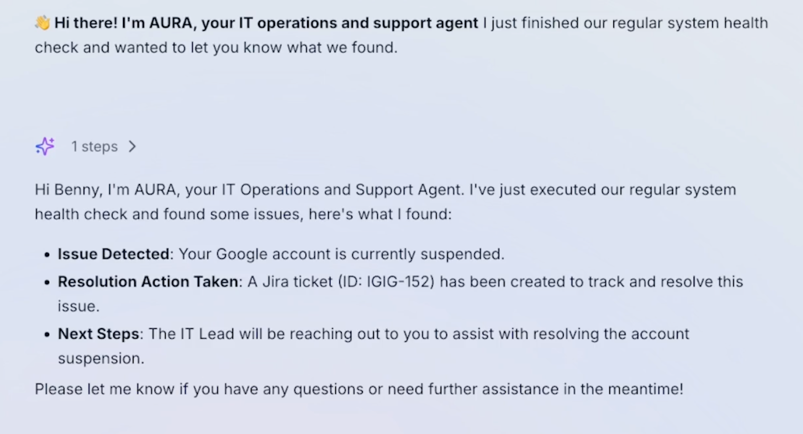 It creates a Jira ticket for the issue, keeping both admins and affected users in the loop. With Aura, password resets, access checks, and all the repetitive work get done without IT getting much involved. This enables teams to focus on more critical tasks that need human attention.