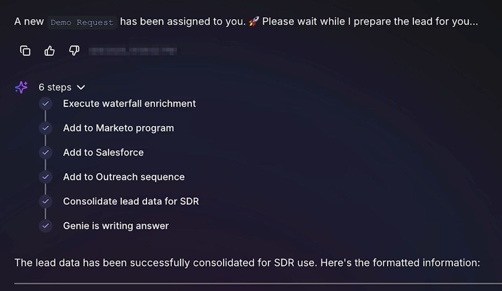 Lead Genie is a lead ops agent that qualifies incoming leads, enriches their data through multiple sources like ZoomInfo, and routes them to the right sales development representative (SDR) based on their timezone the moment they submit a form, accelerating speed to lead.